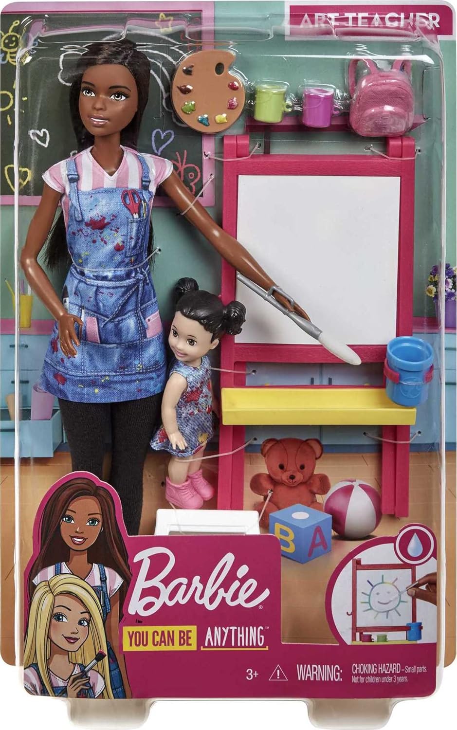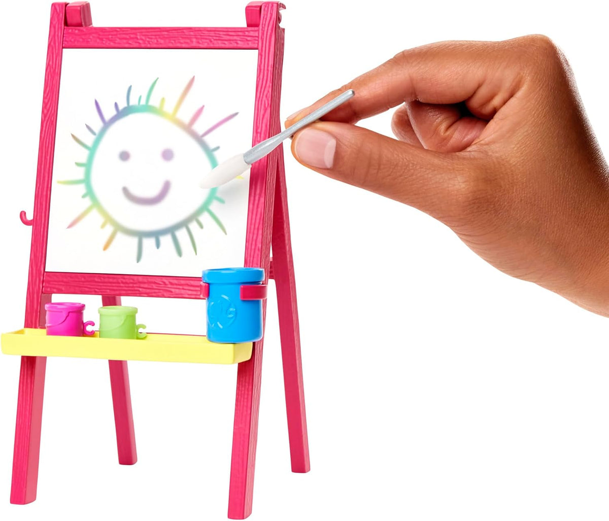 Barbie učiteľka umenia ukáže svojej žiačke, ako maľovať na stojane s prekvapením na zmenu farieb: ponorte štetec (v cene) do vody, maľujte po prázdnej ploche a obraz sa čarovne objaví! Vytvárajte znova a znova tak, že plochu zotriete. Barbie je oblečená v legínach, tričku, teniskách a roztomilom rifľovom zástere, pripravená učiť svoju zvedavú žiačku, ktorá má na sebe roztomilé šaty a batoh. Hračky zahŕňajú stojan s maľovacou plochou, nádoby na farbu a vodu, paletu, štetec a stoličku pre žiačku.
