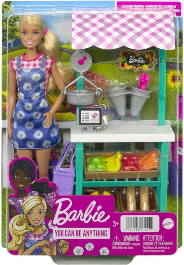 Preskúmajte svet nakupovania s Barbie® Farmers Market hracím setom. Barbie® bábika (blondínka/29 cm) má na sebe roztomilé šaty s károvaným vzorom a kvetinovou zásterou, okrem toho dlhé ružové čižmy a je pripravená pomáhať zákazníkom. Trh má strechu s károvaným vzorom a police s dvoma košíkmi, ktoré obsahujú ovocie, zeleninu, syr a chlieb. Je tu aj nádoba na kvety, kde môže predávať čerstvé kvety. Barbie® bábika môže vážiť zeleninové produkty na váhe so skutočne pohyblivou ručičkou, zabaliť ich pre zákazníkov a zaznamenať nákup na pokladni. Set obsahuje stánok na trhu, ovocie, zeleninu, syr, chlieb, kvety, nákupnú tašku a pokladňu.