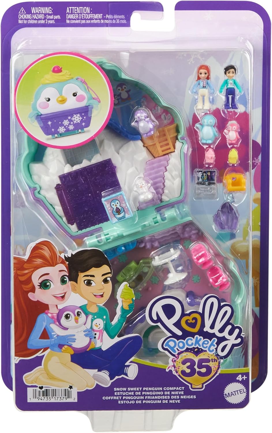 Táto Polly Pocket Snow Sweet Penguin Compact obsahuje dve mikro bábiky, 13 doplnkov a 6 funkcií na rozprávanie príbehov pre najlepšie zimné dobrodružstvo!