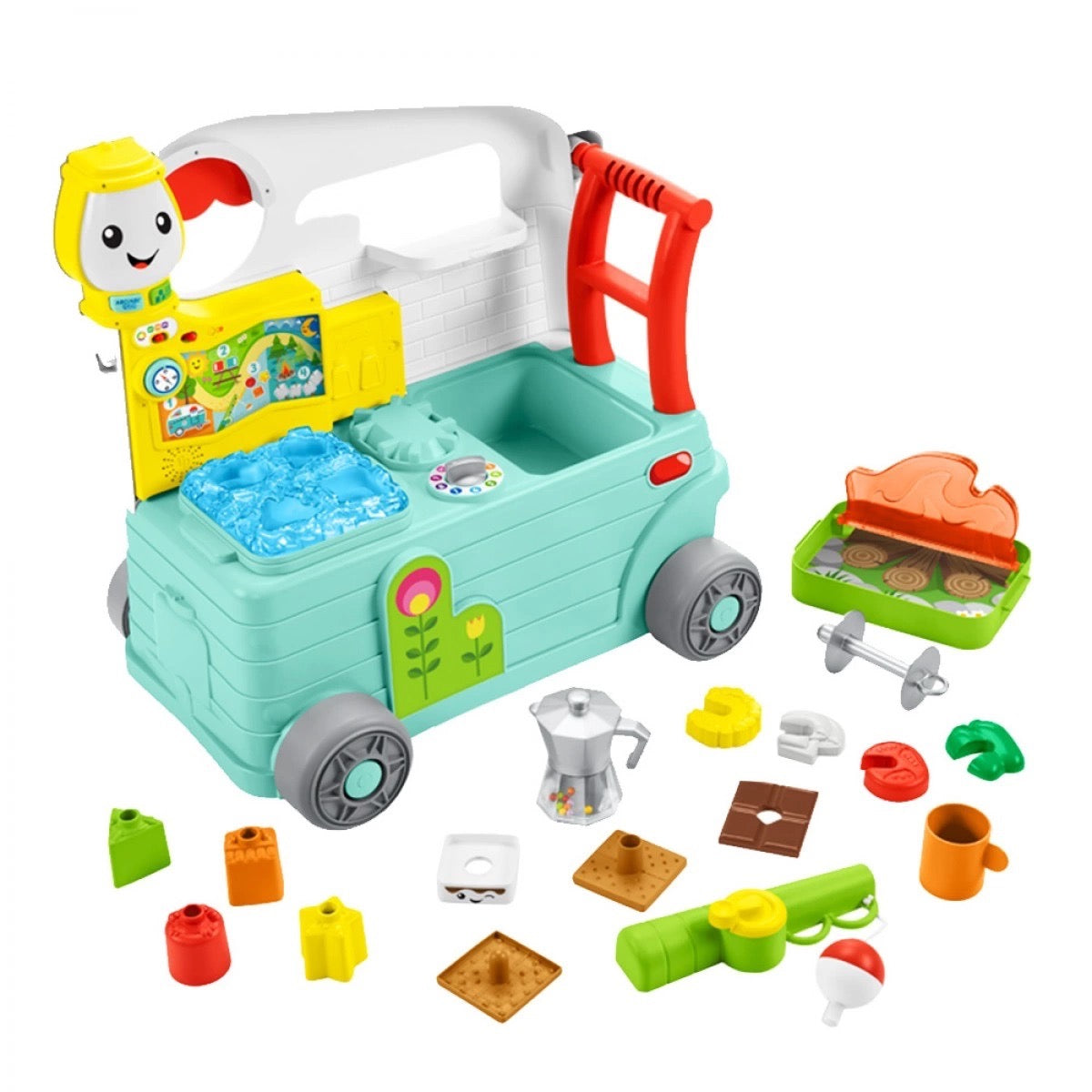 Nezáleží na tom, či vaše batoľa sedí alebo chodí, s 3-v-1 karavanom si užije zábavu a učenie počas kempovania! Táto hračka, navrhnutá v 3 úrovniach s technológiou vývoja podľa veku, obsahuje zábavné piesne, zvuky a svetlá, ako aj písmená, farby, čísla a tvary. V tomto sete je viac ako 10 odnímateľných doplnkov, ktoré robia kempovanie ešte realistickejším. Použite tlačidlo na výber jazyka a rozhodnite sa medzi angličtinou alebo turečtinou.