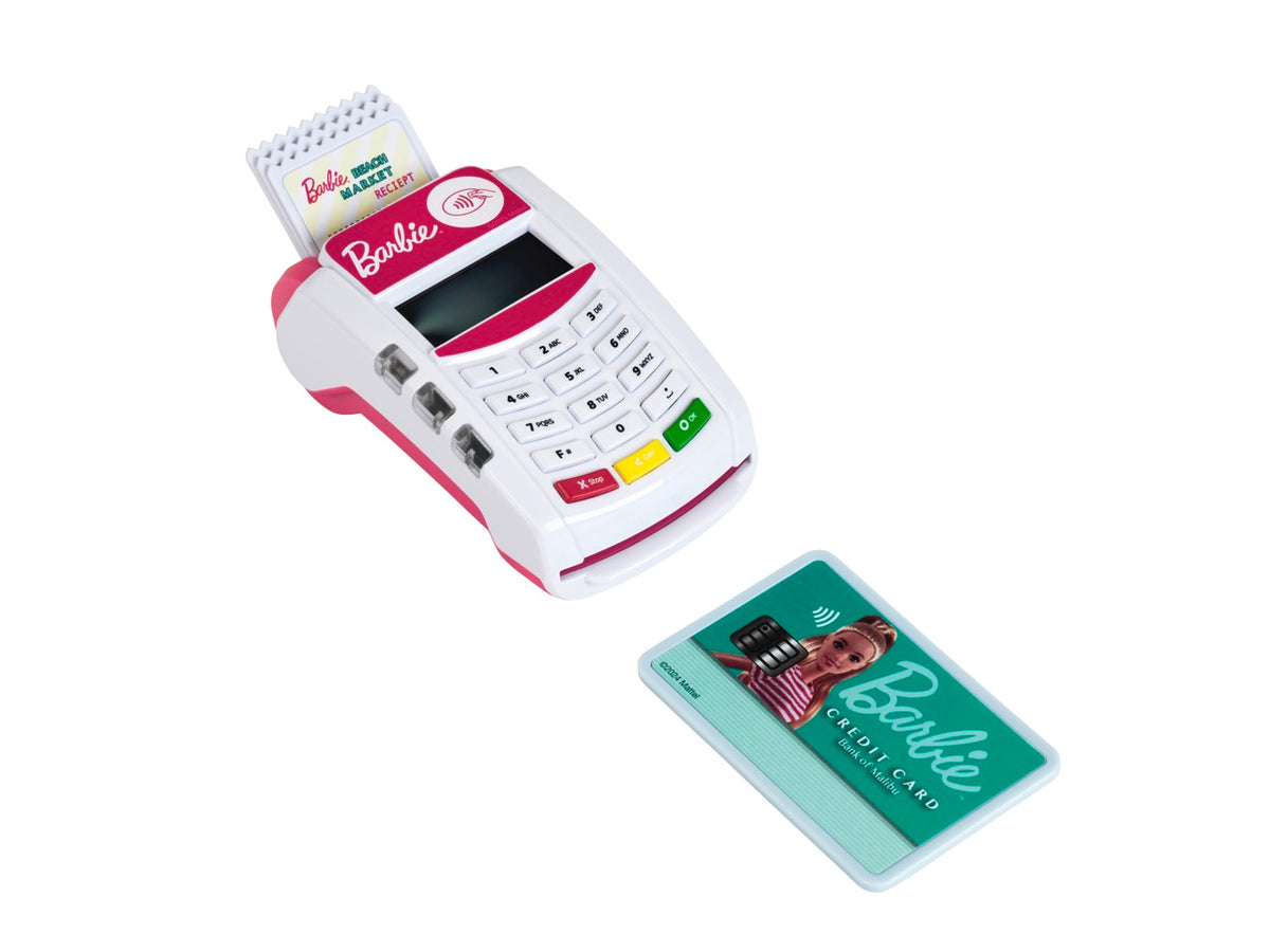 Súčasné časy preberajú Barbie svet: s týmto platobným terminálom v štýlovom dizajne Barbie môžu milovníci bábik všetkých vekových kategórií teraz nakupovať s eleganciou, používajúc cool kreditnú kartu bez problémov s písaním kódu alebo PIN-u. Jednoducho zapnú hračku čítačky kariet a keď pretiahnu kreditnú kartu cez štrbinu alebo podržia Barbie kartu nad symbolom bezkontaktného platenia, moderný terminál oznámi, že karta bola prečítaná a prijatá, vhodným zvukom. Potom vydá potvrdenie o nákupe, ako skutočný účet z pokladne. Takto sa detský obchod mení na štýlový Barbie butik.