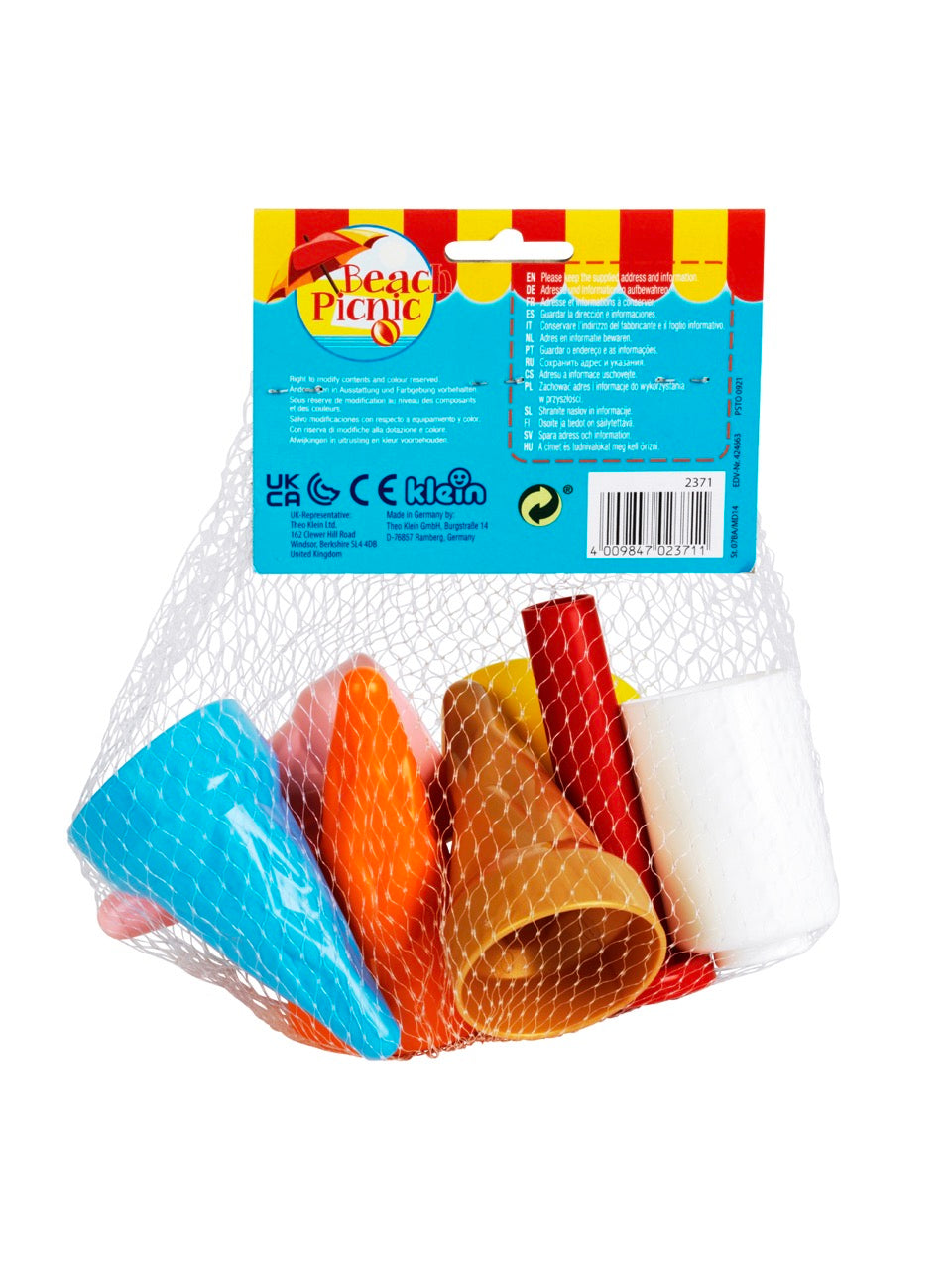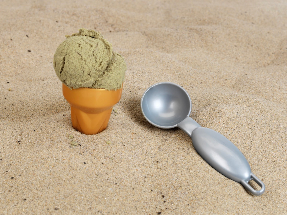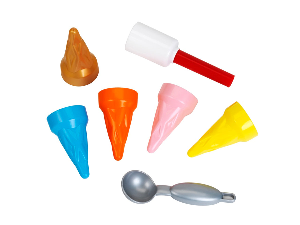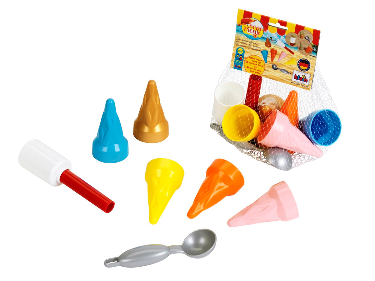 Set na piesok na zmrzlinu obsahuje päť farebných vaflí na zmrzlinu, lopatku na zmrzlinu a naberačku na zmrzlinu.