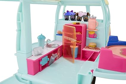 Rozbaľte si viacero prekvapení, vrátane nápojov, hračiek na jedlo, točiaceho sa tanečného parketu, vlajok, pokladne, listu nálepiek a ešte viac! Na začiatok transformácie kempingového prívesu stiahnite zadné dvere dole, zdvihnite strechu a potiahnite menu; potom otvorte obe dvere, aby ste objavili výdajné okno a pripravili sa na grilovanie.