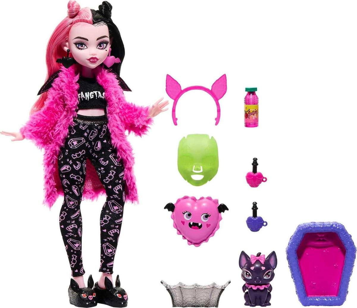 - Štýl a tematické doplnky: Bábika Draculaura™ sa môže pochváliť detailným oblečením a doplnkami na zábavu, ktoré tematicky súvisia s jej jedinečným "scaritage-om". Jej mäkký kardigán je srdcovo pohodlný! Bude ho nosiť cez krátke tričko a potlačené legíny s sieťovanými detailmi v páse. Táto upírka je mimoriadne štýlová so svojimi vesmírnymi drdolmi a nesúrodými veľkými náušnicami! Vzhľad dopĺňa ružovou čelenkou s netopierími ušami a strašne roztomilými šľapkami v tvare netopiera.