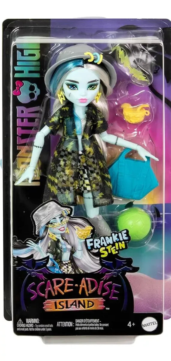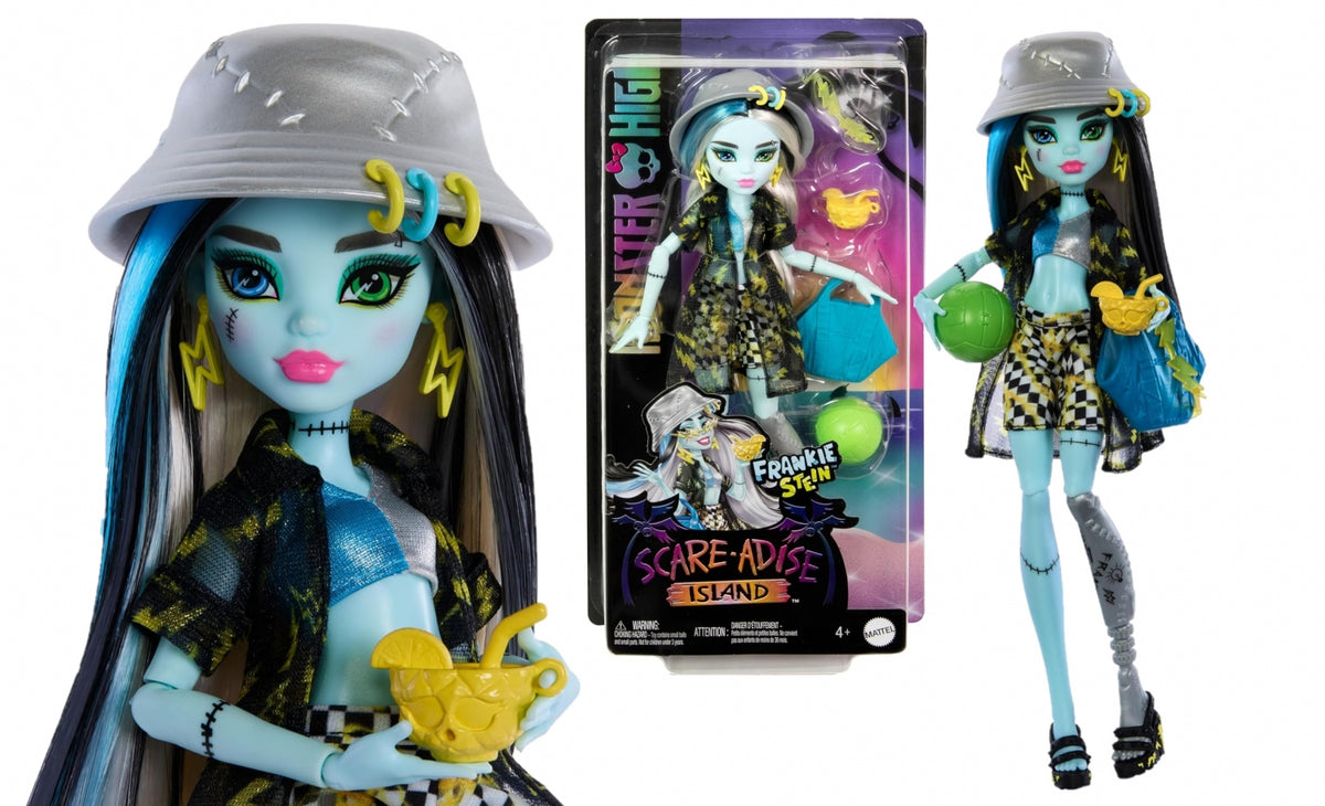 Ta lutka Monster High je pripravljena na počitnice na plaži! Frankie Stein je popolnoma opremljena za strašljivo zabaven oddih na Scare-adise Island z visokozmogljivim kopalnim kostimom, obleko za čez kopalke in dodatki za pripovedovanje zgodb.