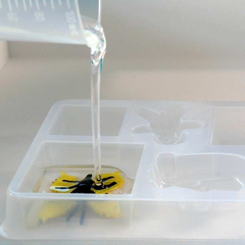 Táto aktivita na samostatnú výrobu je ideálna pre všetkých, ktorí chcú zachytiť krásne spomienky! Suché listy, mušle alebo dokonca plastové zvieratká sa môžu stať nádhernými doplnkami pomocou tohto súpravy živice. Deti si tiež užijú túto jednoduchú aktivitu, pri ktorej vytvoria falošné diamanty, podložky a ďalšie ozdoby do svojej izby! Po príprave základnej živice môžu deti zafarbiť zmes a nalievať ju do rôznych foriem, než pridajú dekoratívne doplnky. Po 24 hodinách, keď zaschne, môžu nádherné priehľadné dekorácie vybrať z foriem.