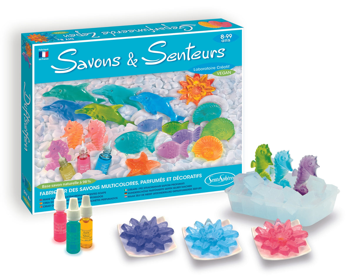Táto sada na vlastnú výrobu vám umožní vyrobiť mydlo vysokej kvality vďaka priehľadnej glycerínovej báze, ktorá sa roztopí v mikrovlnnej rúre alebo vo vodnom kúpeli. Získané vône a farbivá vytvoria jemné farby a vône, ktoré si užijete pri umývaní rúk. Testované pod lekárskym dohľadom, môžu sa používať na najcitlivejšej pokožke bez rizika. Náhradné sady na mydlo sú k dispozícii, aby ste mohli pokračovať v tejto činnosti s ohľadom na životné prostredie. K dispozícii sú náhradné sady. Vhodné pre vegánov: neobsahuje živočíšne produkty.