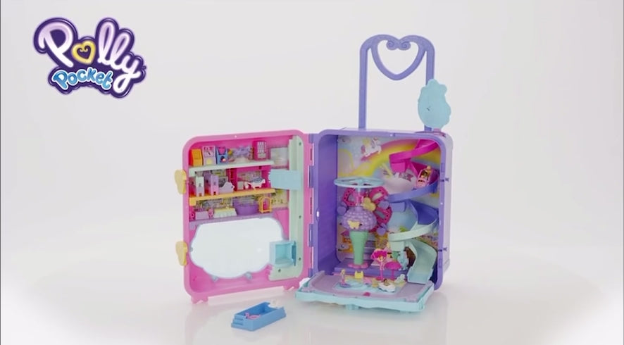 - Tento Polly Pocket™ Pollyville™ Resort Roll Away™ môže slúžiť ako ihrisko a úložisko pre Polly kompakty.