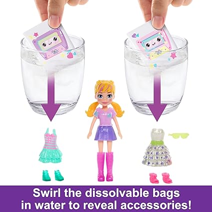 - sl Deti môžu objaviť tematické prekvapenia, ako je 7,6 cm bábika Polly Pocket do skrinky, papierový balíček, ktorý sa rozpustí vo vode a odhalí doplnky, a exkluzívna kapucňa pre bábiku Polly!
