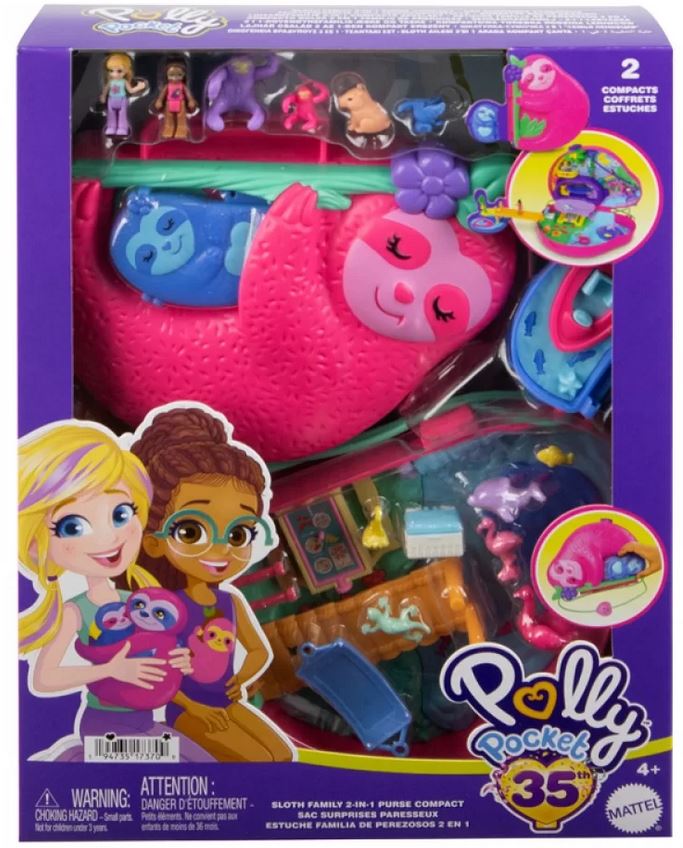 Zabávajte sa s Polly Pocket™ v tejto roztomilej Sloth Family 2-v-1 taštičke kompakt! Vonkajšok taštičky je navrhnutý ako mama lenochod s mláďaťom lenochoda, ktoré je pripevnené na jej bruchu! Tak mama ako aj mláďa lenochoda sa otvoria a odhalia tropickú džungľovú tematickú hraciu sadu s 2 mikro bábikami a 12 doplnkami (vrátane 8 domácich miláčikov)! Obe kompaktky sa spoja mostíkom pre dokonalý 2-v-1 herný zážitok. Prejdite sa po lanovke s tukaním kamarátom v kompakte mamičky lenochoda alebo otvorte stan lenochoda a objavte pohodlnú hojdačku. Užívajte si vodný bazén a zatočte sa pri vodopáde! Potom prejdite mostíkom do kompaktu mláďaťa lenochoda a nájdite tajnú pláž na zbieranie banánov alebo sa vyberte na jazdu loďou! Keď príde čas odísť, spojte oba kompaktky a použite taštičkový popruh na hranie kdekoľvek a kedykoľvek! Skvelý darček pre deti od 4 rokov, najmä pre tých, ktorí milujú zvieratá!
