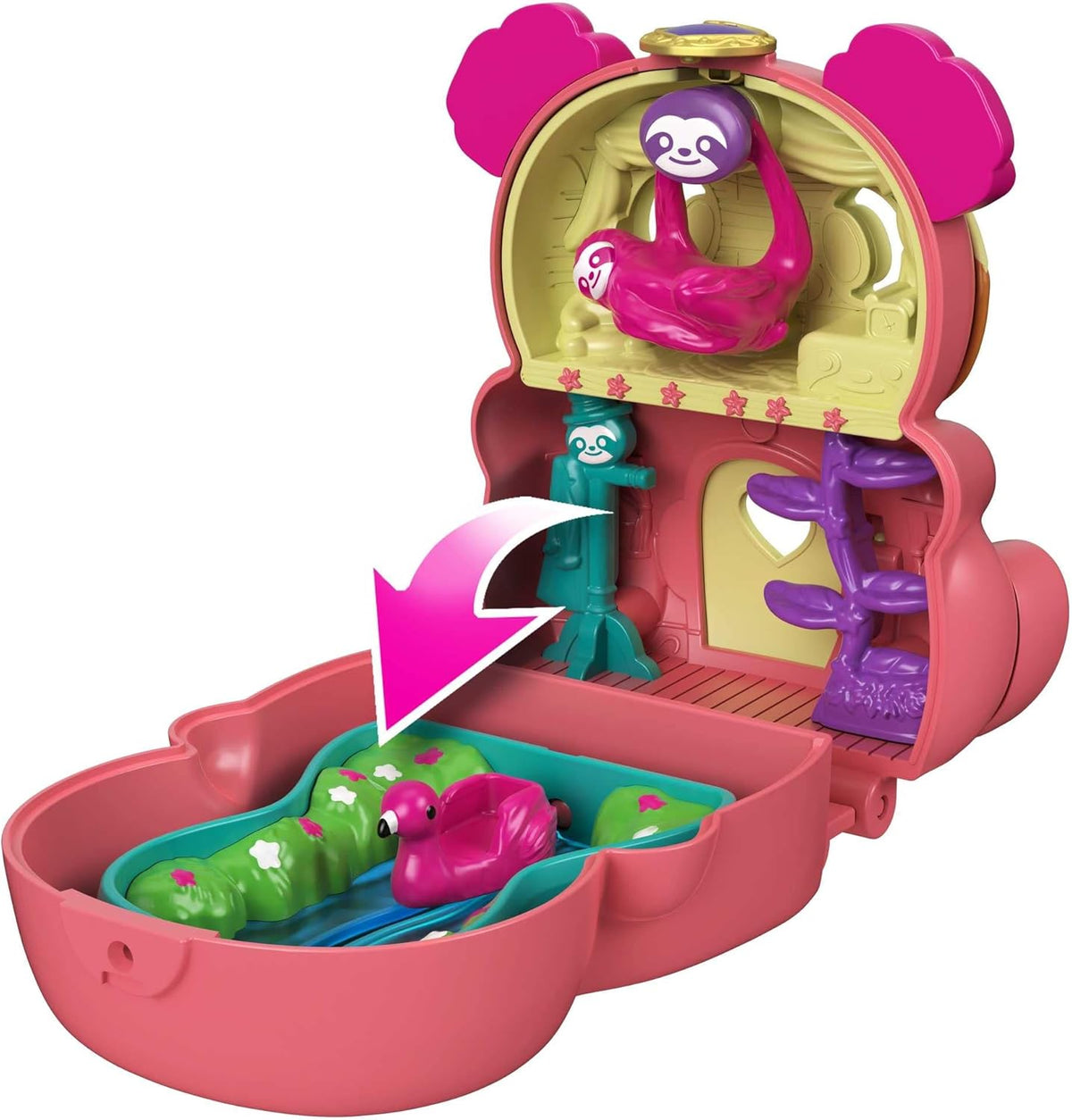 - Pre dodato hraciu plochu otočte dno kompaktného púzdra pre ešte viac možností hrania! Kompakt obsahuje mikro bábiku s 5 pohyblivými kĺbmi na pózovanie a hranie; jednu figúrku lenivca; a zábavné funkcie na objavovanie: hojdačku pre lenivca, plameniaka, ktorý kĺže po jazierku, a ešte viac!