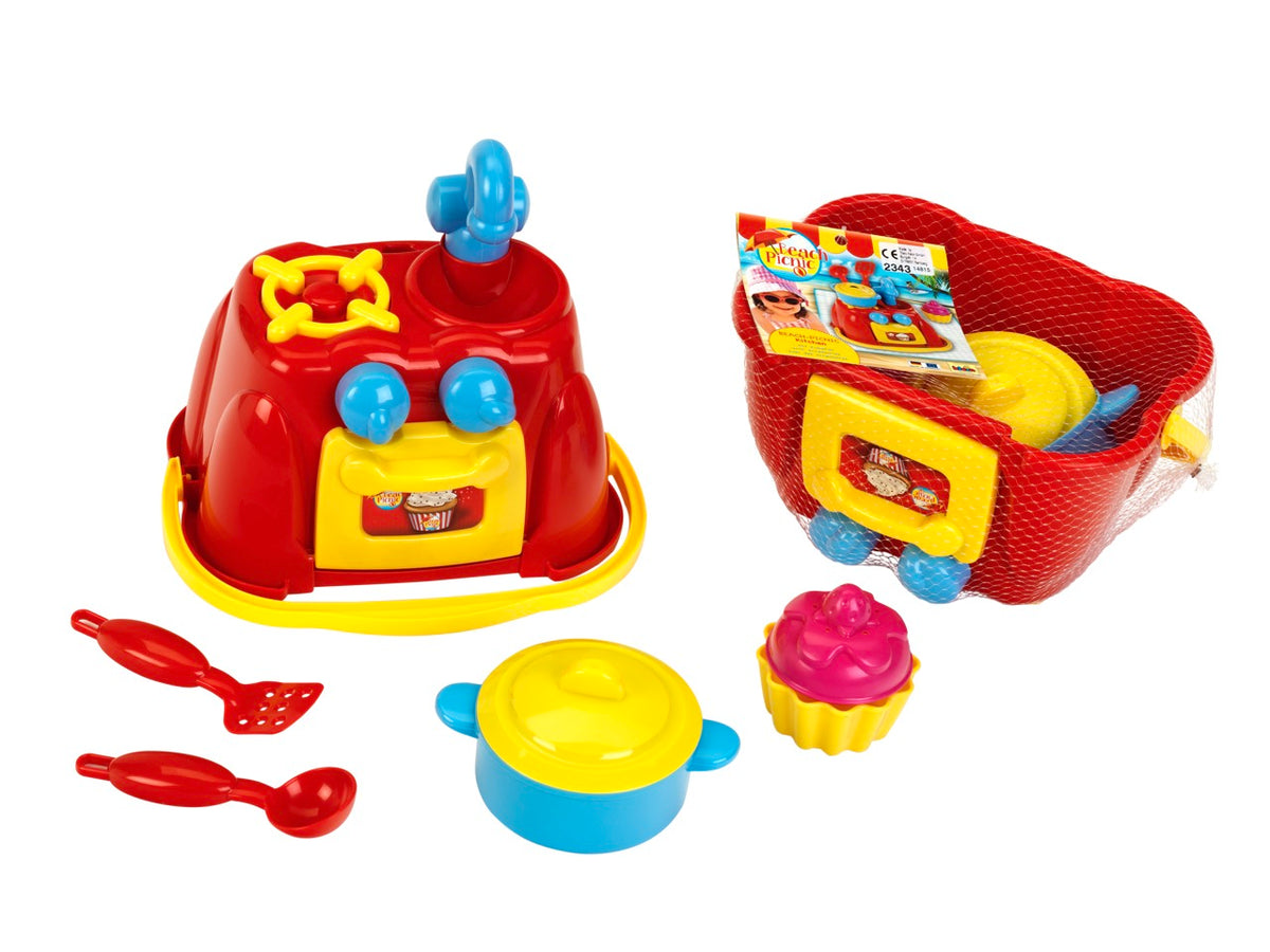 Tento set na pláž a pieskovisko je dobre vybavená malá kuchynka s varnou doskou, umývadlom, vodovodnou batériou, rúrou, hrnčekom s viečkom, naberačkou, lopatkou, stojanom na muffiny s polevou na muffiny. Obzvlášť praktické: Kuchynka je zároveň vedro, v ktorom je možné prenášať a skladovať doplnky.
