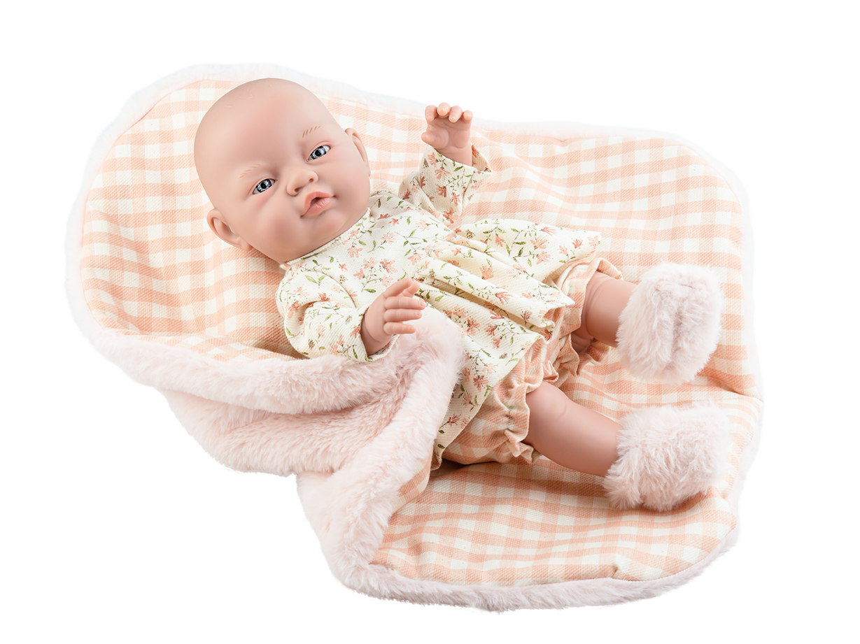 • Material, z ktorého je vyrobený, má mäkší dotyk a vôňu, aby viac pripomínal bábätko. Je oblečený v kvetinové šaty a nadýchané nohavičky. Priložená je aj jej károvaná a nadýchaná deka.