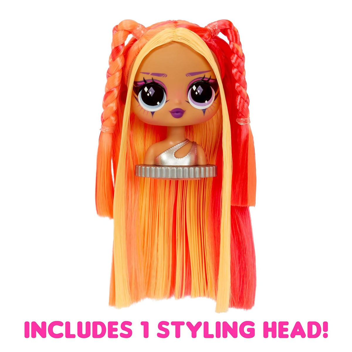Zmeňte Baileyin vzhľad okamžite tak, že vymeníte jej modré, fialové a ružové vlasy za neonovo magentový a oranžový štýlový cibuľový účes, ktorý jednoducho pripevníte na telo bábiky.